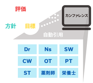 各職種がカンファレンス前に評価・方針・目標をまとめることで事前に他職種の記載内容を確認できるため、カンファレンスにおける討議の活発化、効率化へと繋がります。